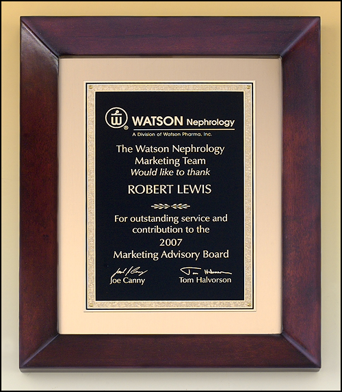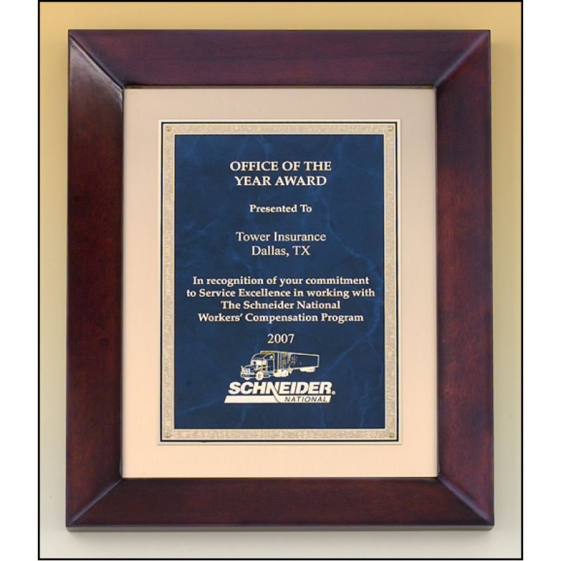 Hand rubbed cherry finish frame 9x12 plaque with a plate on brushed metal gold background Laser engravable brass plate(s). Individually boxed. 12 x 15