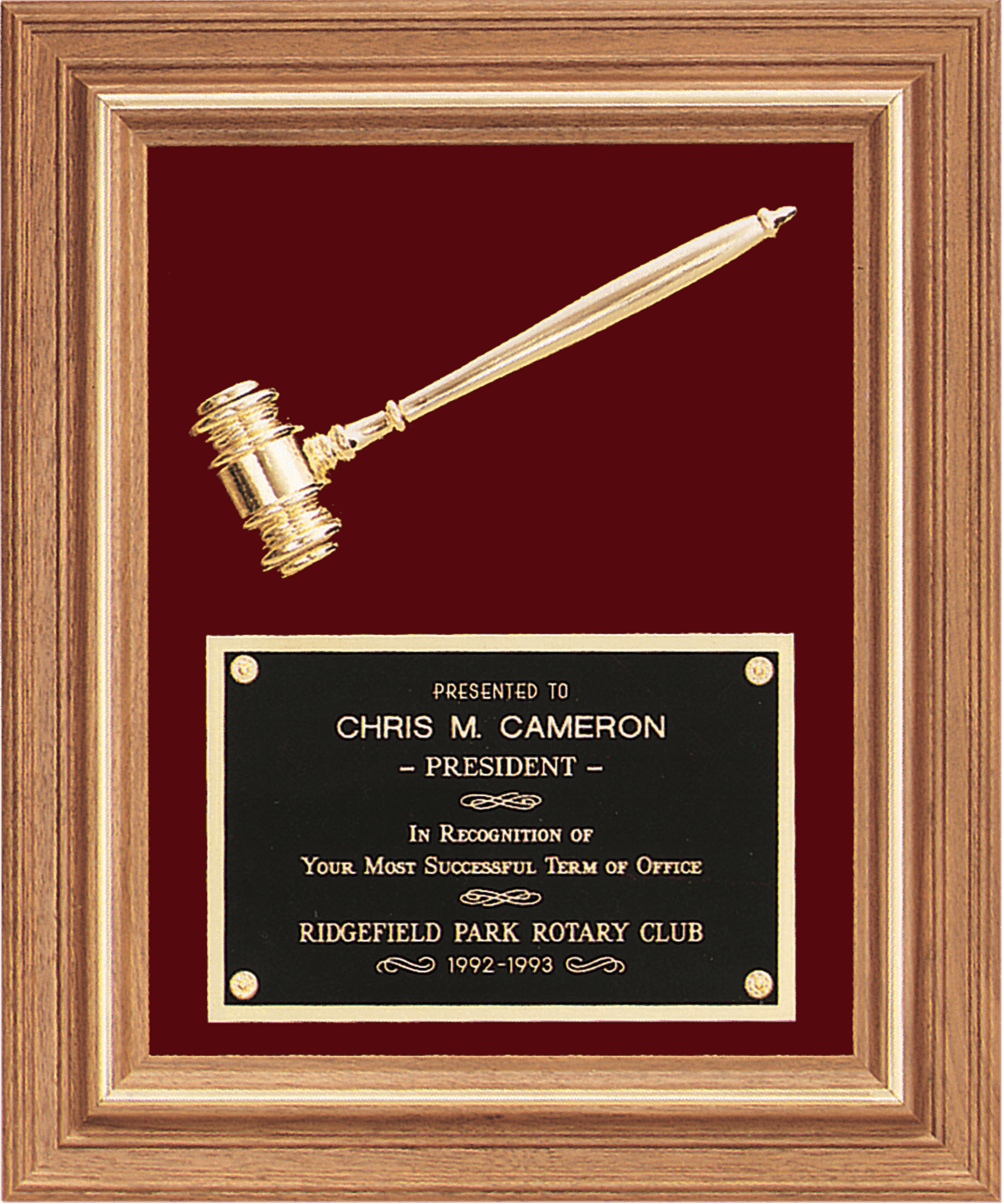 American walnut frame with gold trim, gold electroplated metal gavel on velour background. Laser engravable brass plate(s). Individually boxed. 15 x 18
