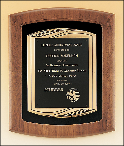 Furniture finish American walnut frame with black velour and an antique bronze finish frame casting. Laser engravable brass plate. Individually boxed. Made in USA. 14 x 17