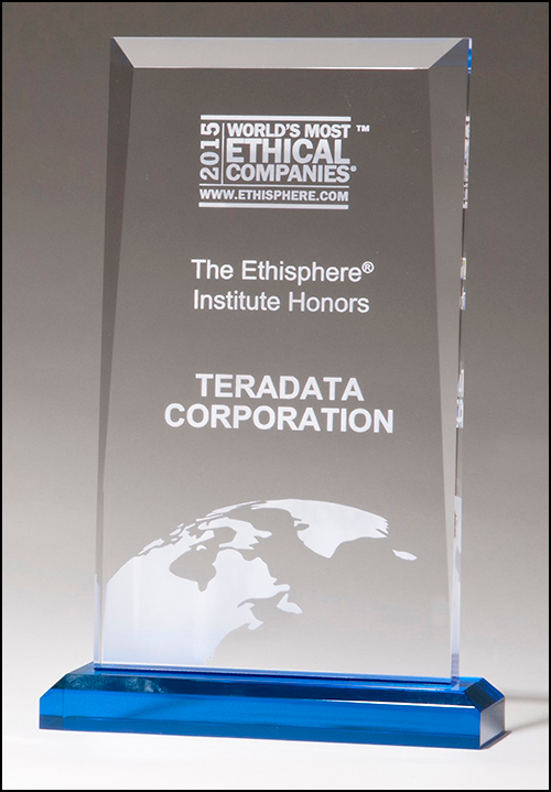 Apex Series clear acrylic award with color highlights and matching color base. 3/4" thick clear acrylic. Individually gift boxed.