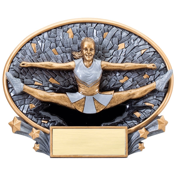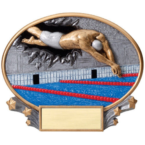 The 3-D life-like action scene BURSTS THRU the colored sports background. The dimensional Hand Crafted "SilverStone" Sculptured Sports Ovals are perfect for Free-Standing or as a Wall Plaque. The pewter-finished resin oval with gold highlights and a full-color sports icon provides something completely different for your upcoming award event. A rectangular framed area is available for personalization.