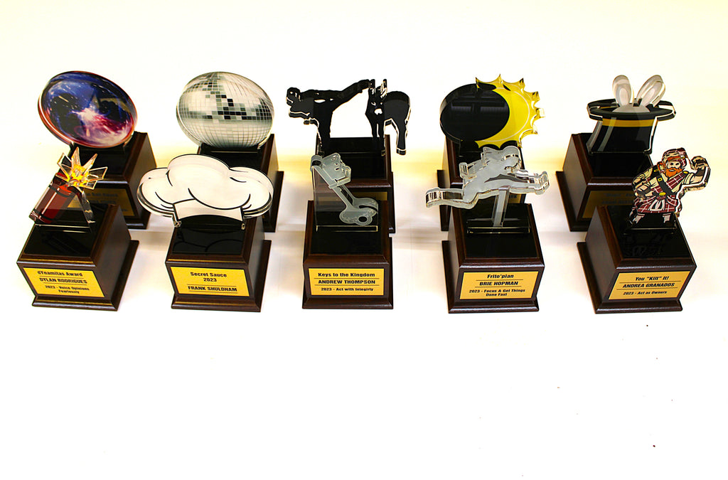 Define your event brand with Custom Shaped Acrylics with unlimited design options. Custom logo and text in full color. Available in multiple sizes for different levels of achievement.