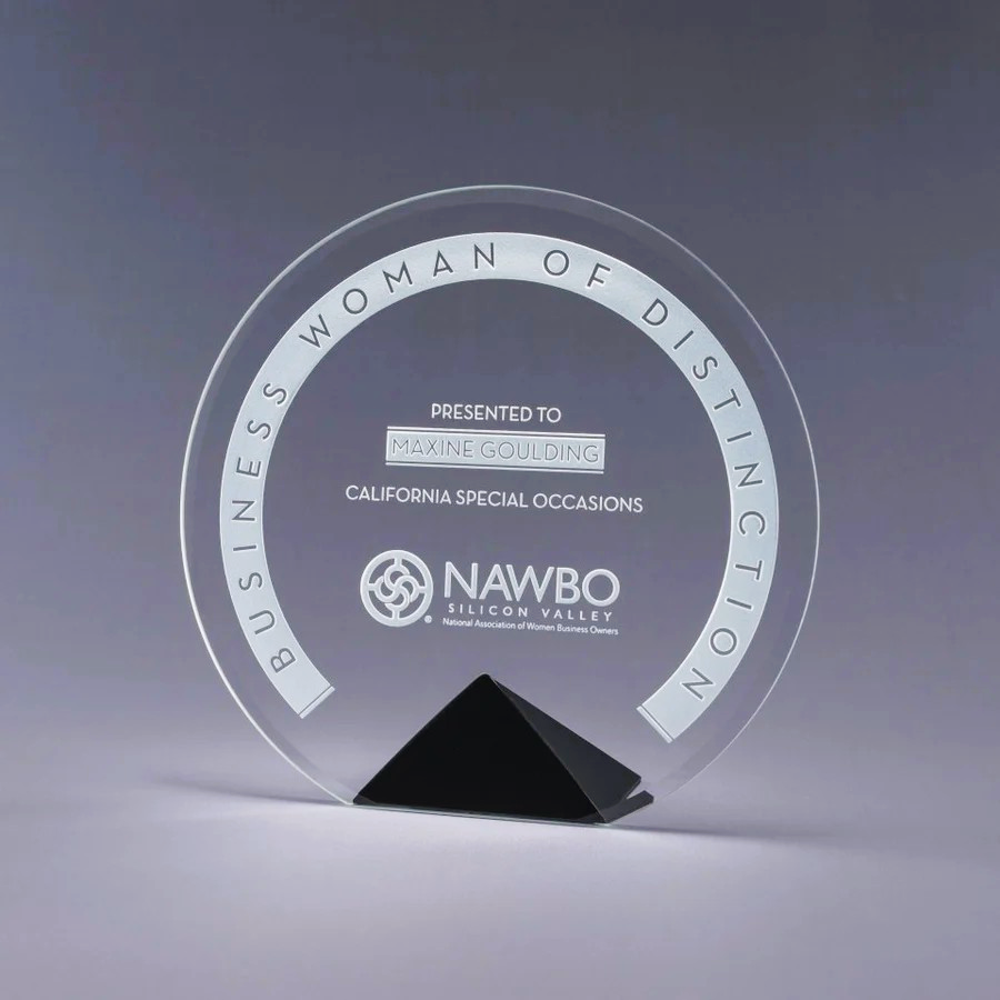A classic circle for engraving your message with a triangular base angled to add presence to your award. Made from beveled Starphire Crystal whose aqua tint is accented with your choice of base, also available in red, blue, or clear.