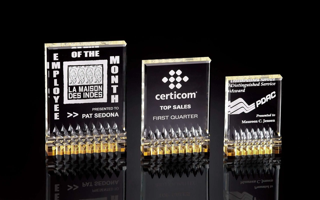 The design of this acrylic award lets the gold refract up through the award. All items include lettering and logo in one location. Can be lasered or UV color printed. Also available in red, blue, and purple.