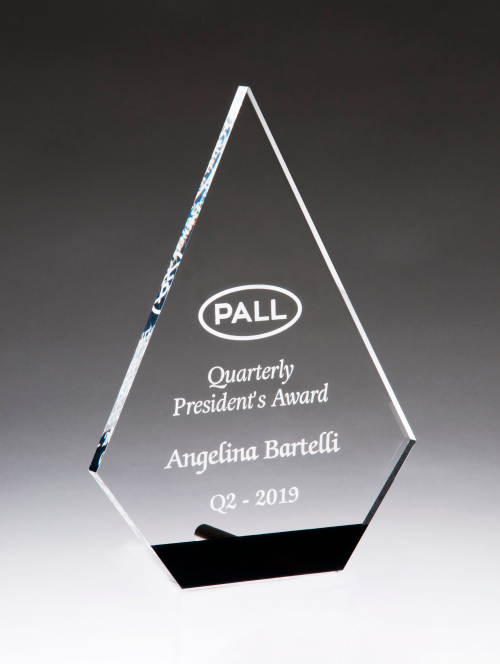 Diamond series clear acrylic with black accent and silver post. 3/8" thick acrylic. Post shipped unattached. Individually gift boxed.