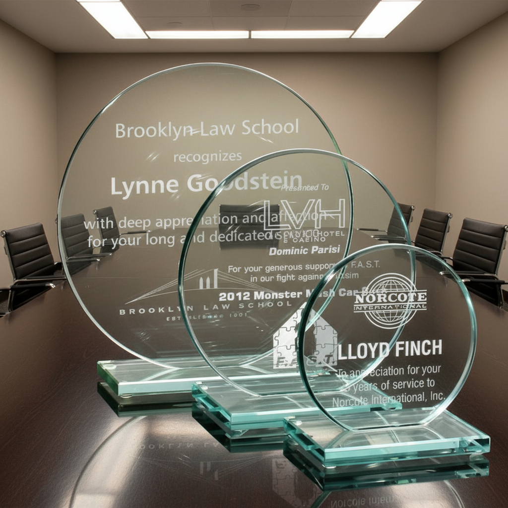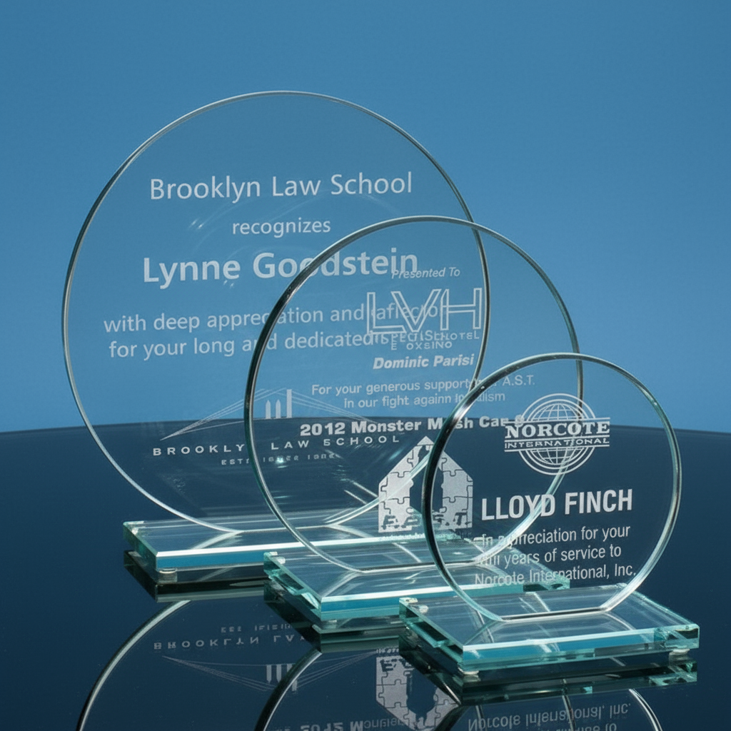 This classic shaped circular award is made of jade glass and is assembled on a matching base. Available in three sizes, this award is perfect for tiered recognition programs. The Imprint surface is large enough to hold your personalized message along with your logo. Multiple imprint methods are available on the round upright. This classy award is budget-friendly and will look great on any desk or bookshelf.