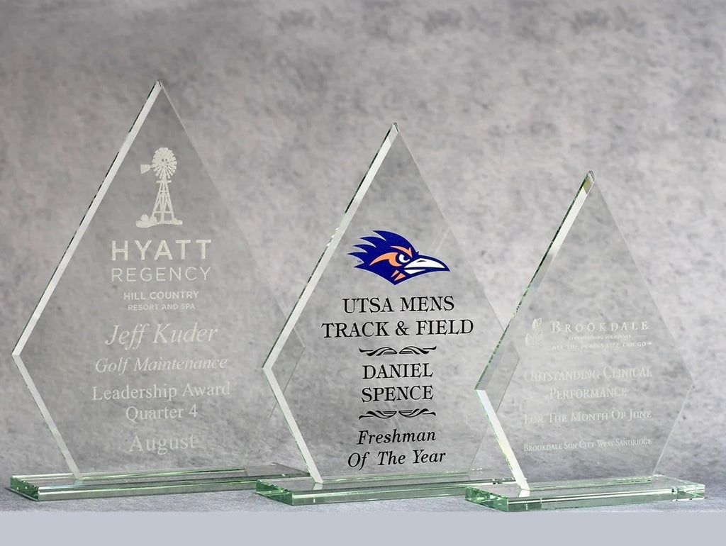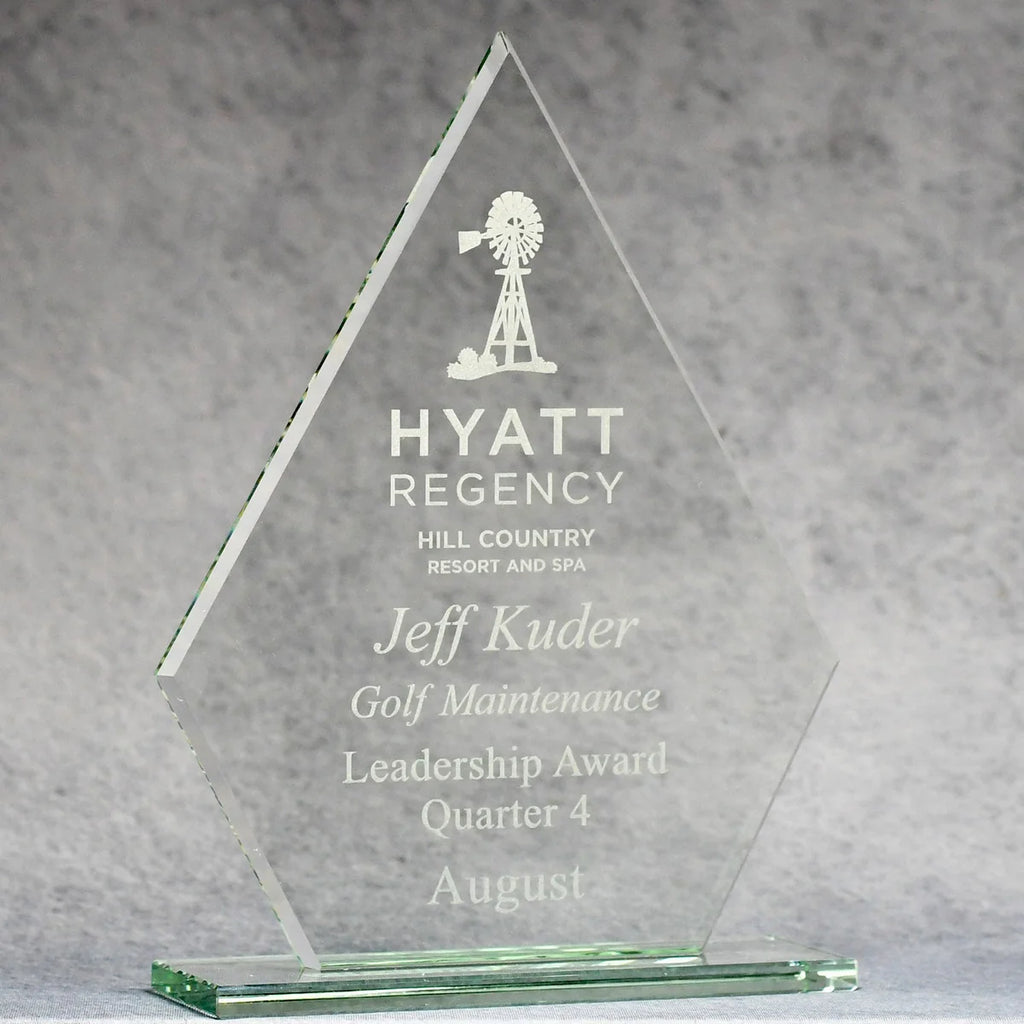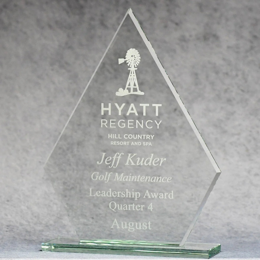 This beautiful, economical award is made of jade glass and comes on a jade glass base. Available in three sizes, it is perfect for a tiered recognition program. The diamond shape gives the appearance of sophistication. The imprint area is large enough for your personalized message and logo and the award can be imprinted digitally to enhance the visual impact. This quality product will look great on anyone's desk or bookshelf.