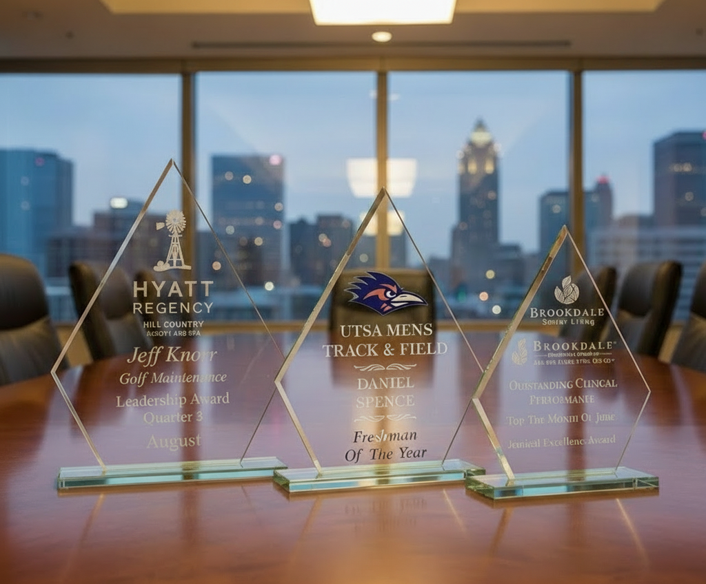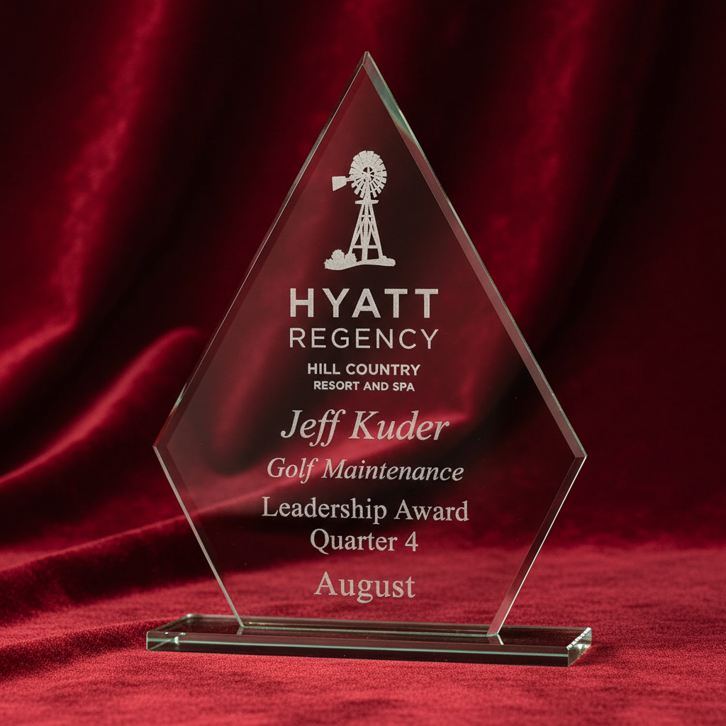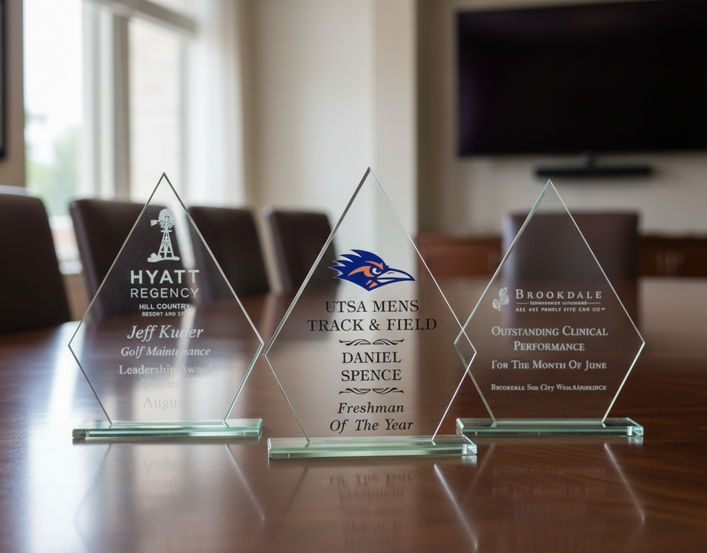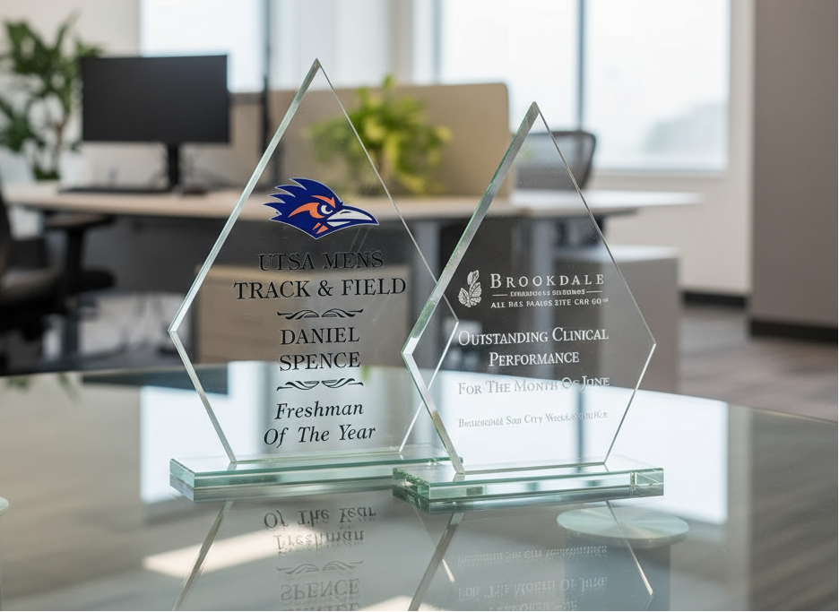 This beautiful, economical award is made of jade glass and comes on a jade glass base. Available in three sizes, it is perfect for a tiered recognition program. The diamond shape gives the appearance of sophistication. The imprint area is large enough for your personalized message and logo and the award can be imprinted digitally to enhance the visual impact. This quality product will look great on anyone's desk or bookshelf.