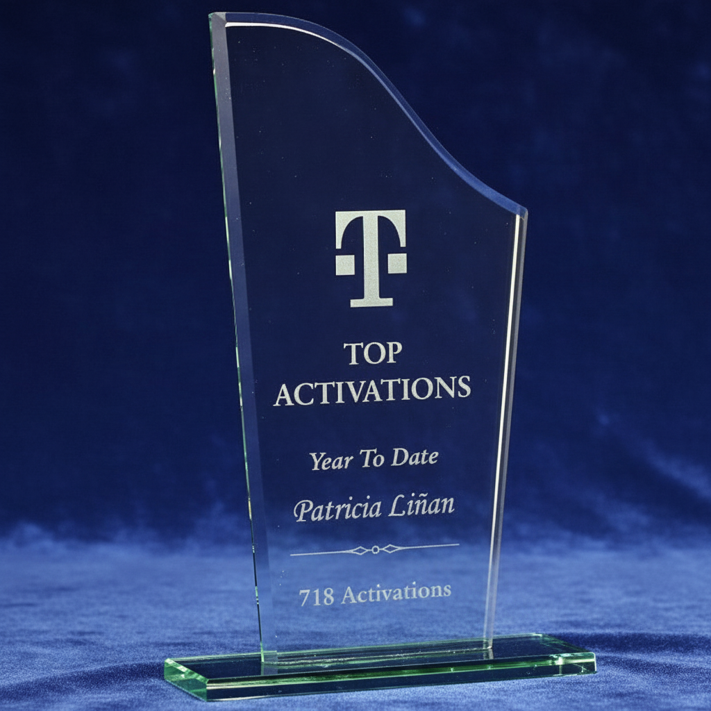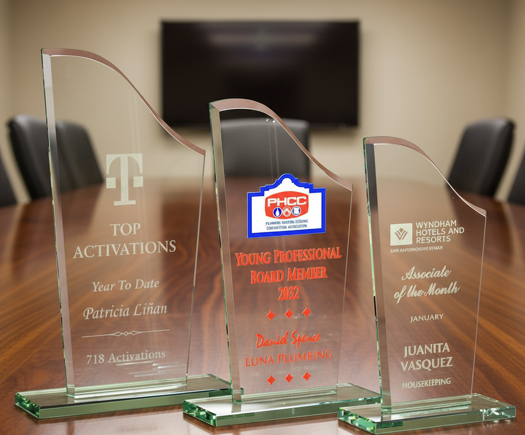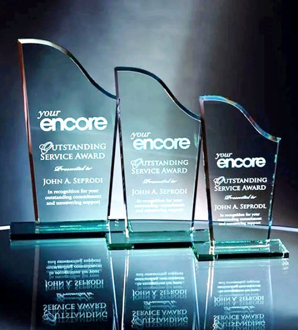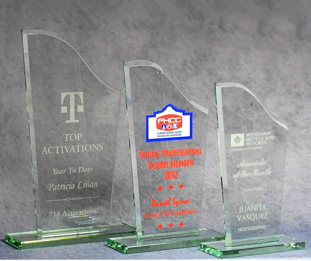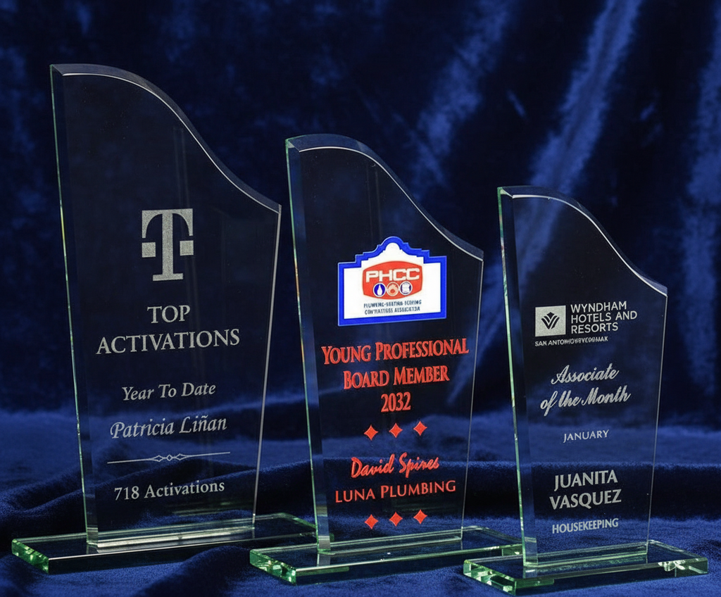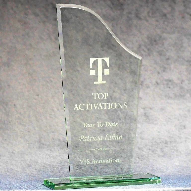 The unique swoosh shape is perfect for the unique recipients in your world. The award is made of jade glass and comes mounted on a matching jade glass base. Being available in three sizes, it is perfect for tiered recognition. The imprint area is large enough to hold your personal message and logo.