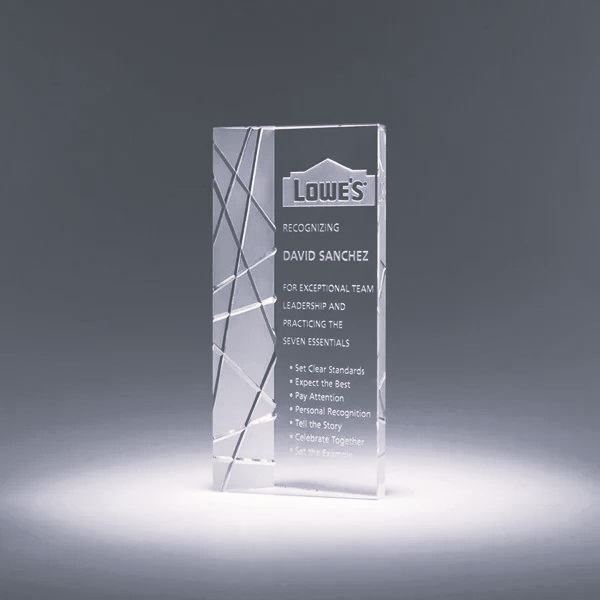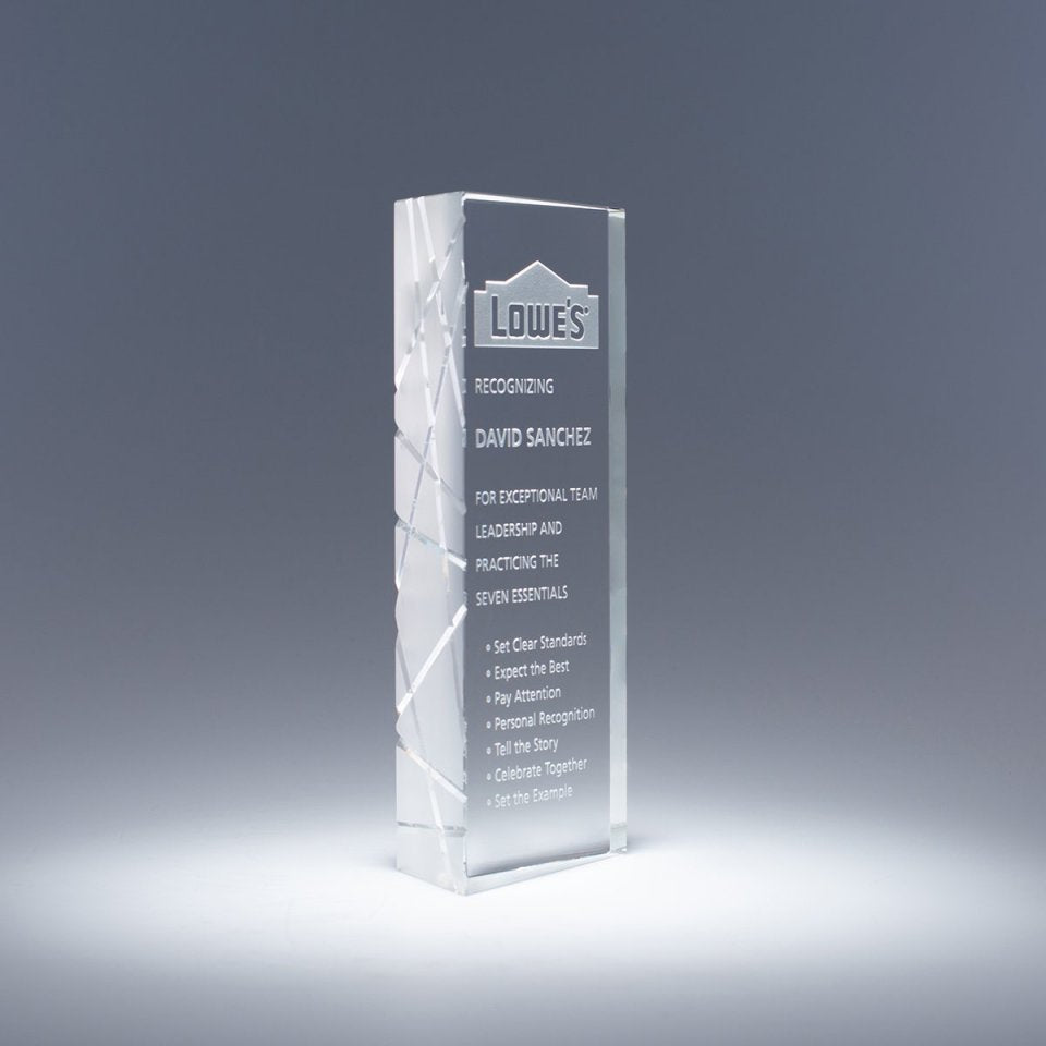 It does not get any more designer than this! Lean yet interesting, this recognition piece becomes dynamic through its use of overlapping diagonal cuts that pop brilliantly on its frosted plane.