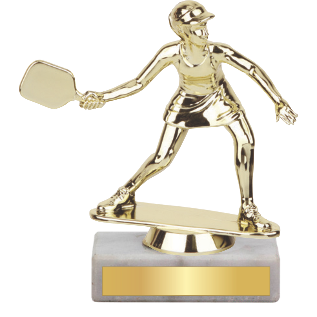 Celebrate the winning pickleball performance of your favorite female player with our Female Pickleball Trophy. Small but mighty, this award highlights her outstanding achievement on the court. Perfect for any event, this trophy captures the playful spirit of the game. Personalize the plate for any event or competition.