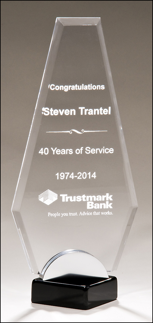 Flame Series acrylic black and silver metal base. 3/8" thick acrylic clear only. Individually gift boxed. 4.5" x 7.75"