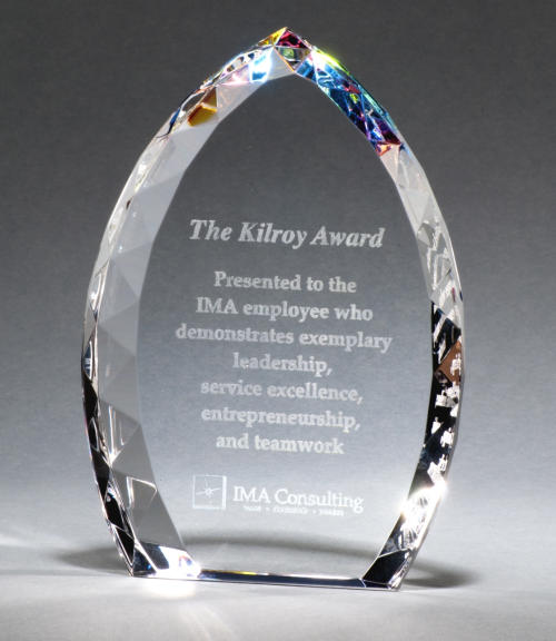 Freestanding crystal flame with jeweled edge and prism-effect base. Our special prism-effect coating sends a rainbow of light through the polished jewel edges of this special award. Produced from the highest quality lead-free optical crystal this flame award will show the recipient how important they are to your organization. All crystal awards are suitable for laser engraving or sand etching. Packaged in padded, satin-lined gift boxes.