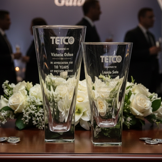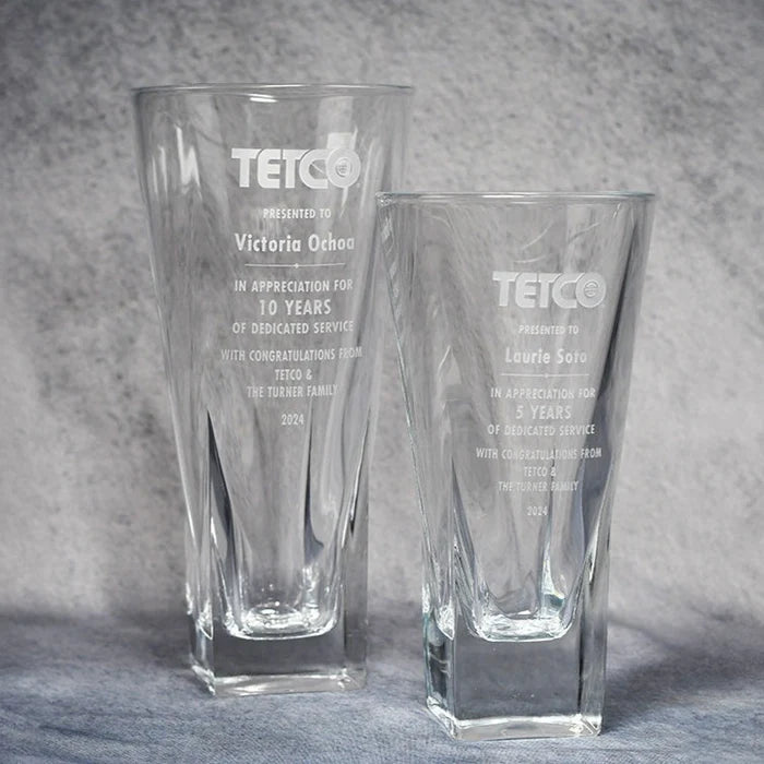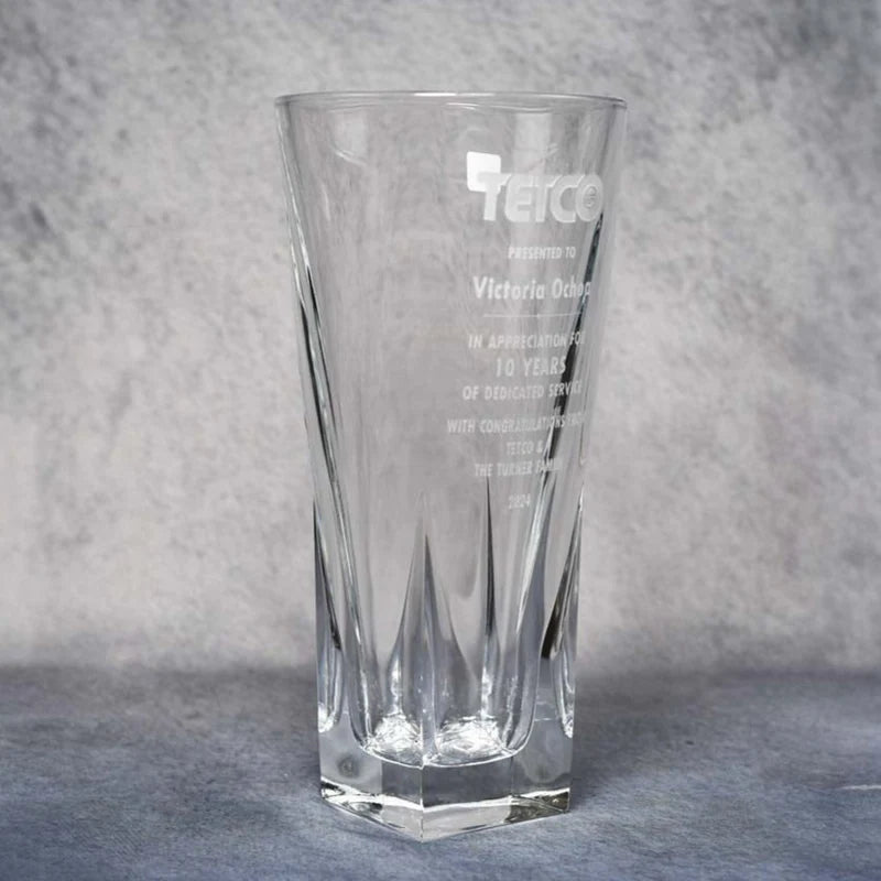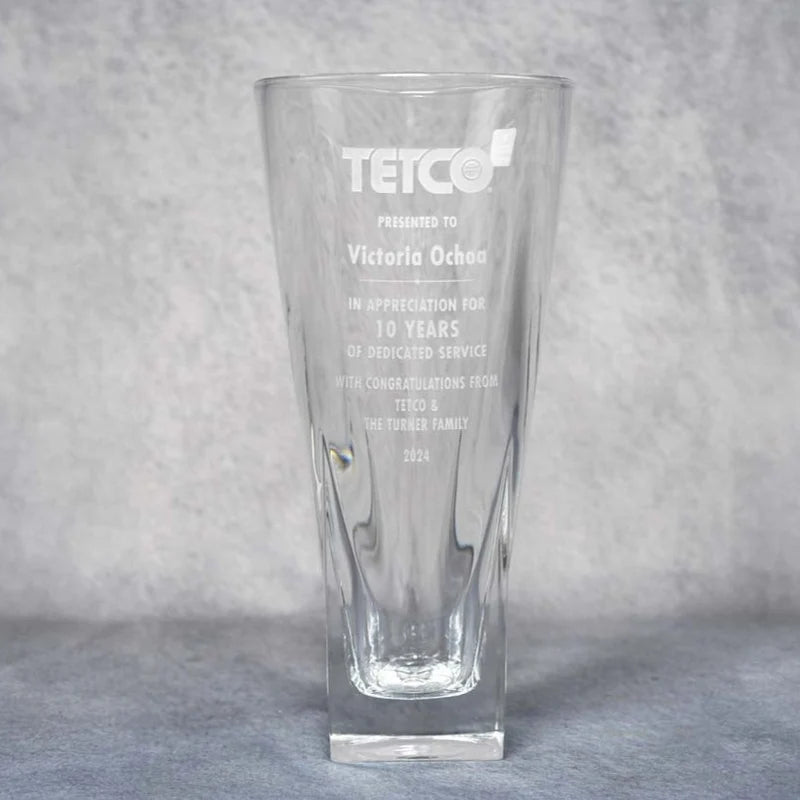 A square-bottomed glass vase makes a sophisticated recognition award. Its unique shape stands out from traditional round vases for an elevated look. Perfect for any occasion.