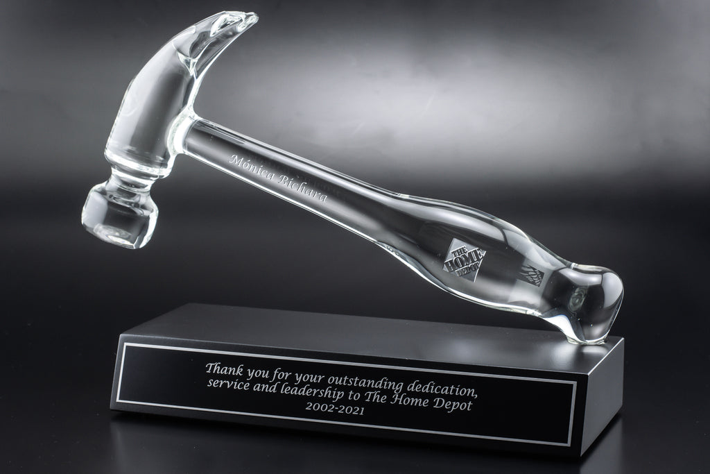 This Home Depot Exclusive Crystal Hammer is hand blown here in Atlanta by local artisans. Each piece is then Deep Sand Etched and silver color filled with the Home Depot Logo and the Recipients name. The Crystal Glass Hammer rest on a beautiful matte black base adorned with a Laser Engraved Shiny Black Engraving plate. The lettering and border show thru the engraving in brilliant silver.