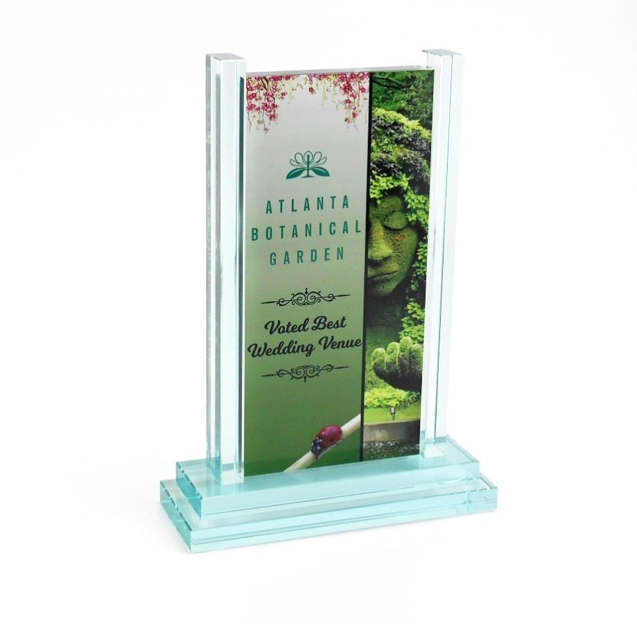 Your text or full color picture quality art or logo included. Your art and text are beautifully printed on both side of the award for presentation from all angles! This solid jade crystal glass award feels substantial in your hand.