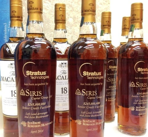 Let us engrave your bottles. Have your custom logo and message engraved onto your liquor bottles. Work with our in-house artists to come up with the perfect custom engraving art for the perfect gift. We sand etch engrave each bottle for superior quality compared to other processes. For a gift that is sure to please, custom etch your favorite wine or liquor bottle into the perfect gift for any occasion.