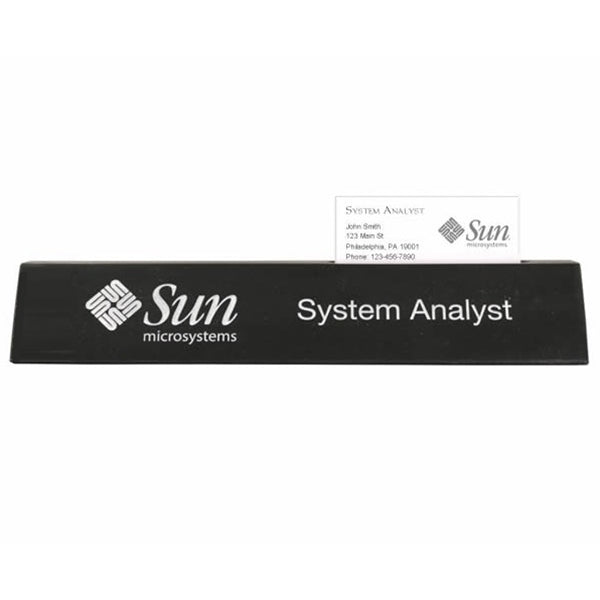 A variation on the standard desk wedge is this solid black marble name wedge. Carved in the top of the marble is a slot to hold business cards. The marble is sand-etched, and the lettering is color-filled with metallic gold paint to provide luxurious contrast.