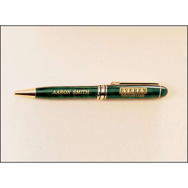 Your choice of blue or green marble finish, solid brass caps and barrels. Mechanically and laser engravable. Packaged in a 2 piece gift box with a gold top and black bottom.