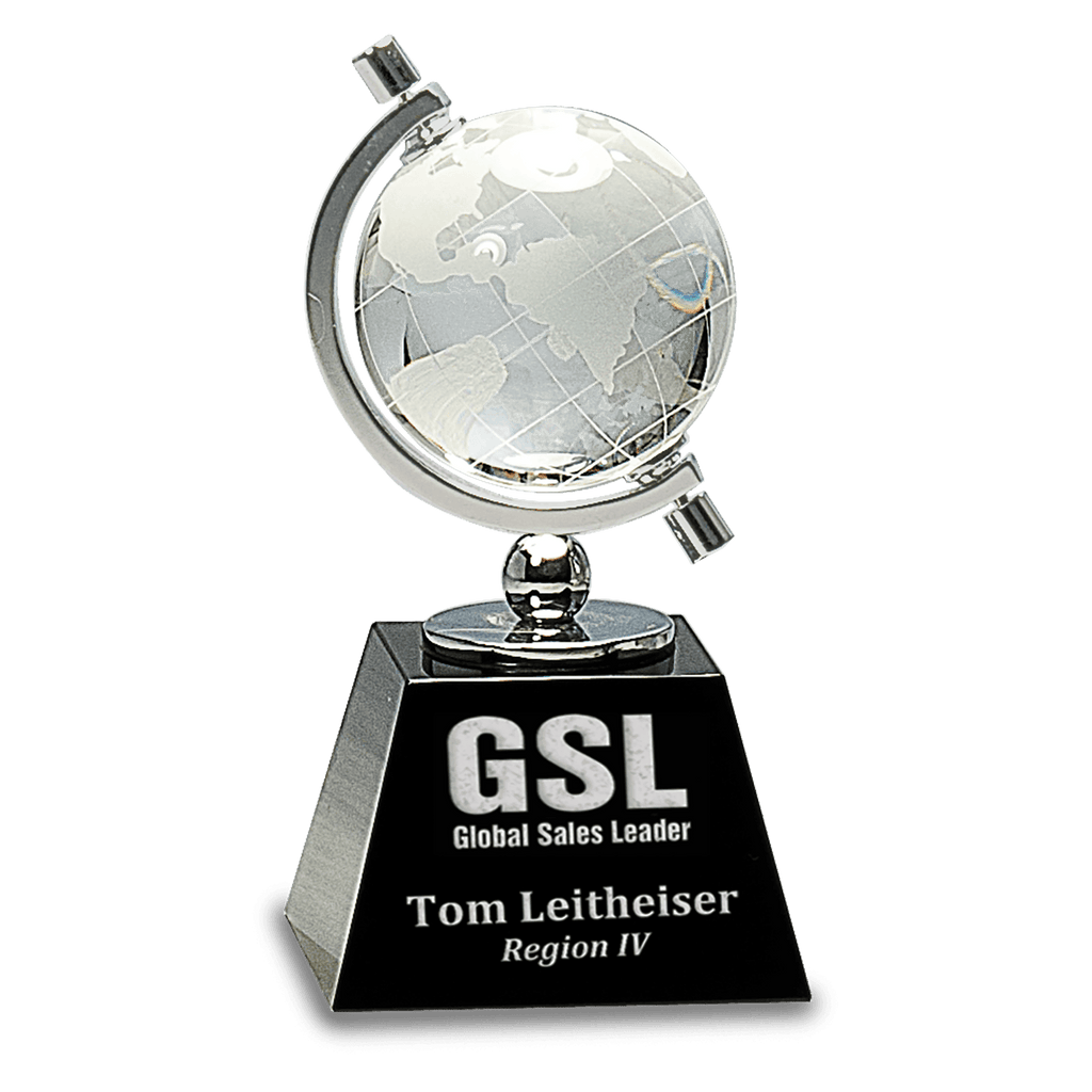 This 6”H Optic Crystal Globe Award features continents and latitude/longitude lines on a 60mm globe that spins fully on its chrome-plated axis. The black optic crystal base is a 3" x 3" x 2” pyramid, finished with a matching laser engraved personalization plate.