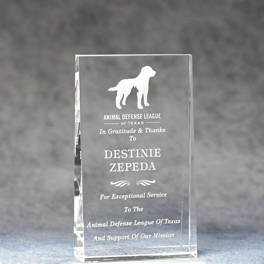 The Optic Crystal Standing Wedge Award design is given a designer flair with the polished edges. Standing tall and proud, the Crystal Wedge Award commands attention with its elegant silhouette and captivating presence this trophy is a testament to dedication and success. The flat face allows for a liberal etching area. Available in 5" and 7". Gift Box included.