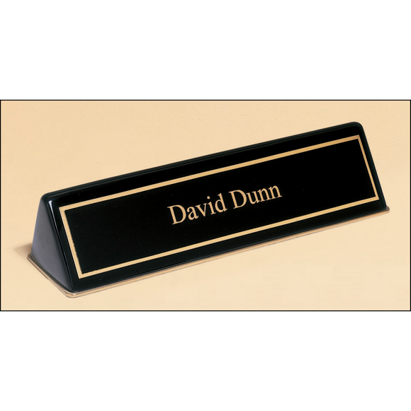 Piano-finish desk name plate with solid brass engraving plate. Gold metal base with felt bottom. Individually gift boxed. 9.5 x 2.5 x 2