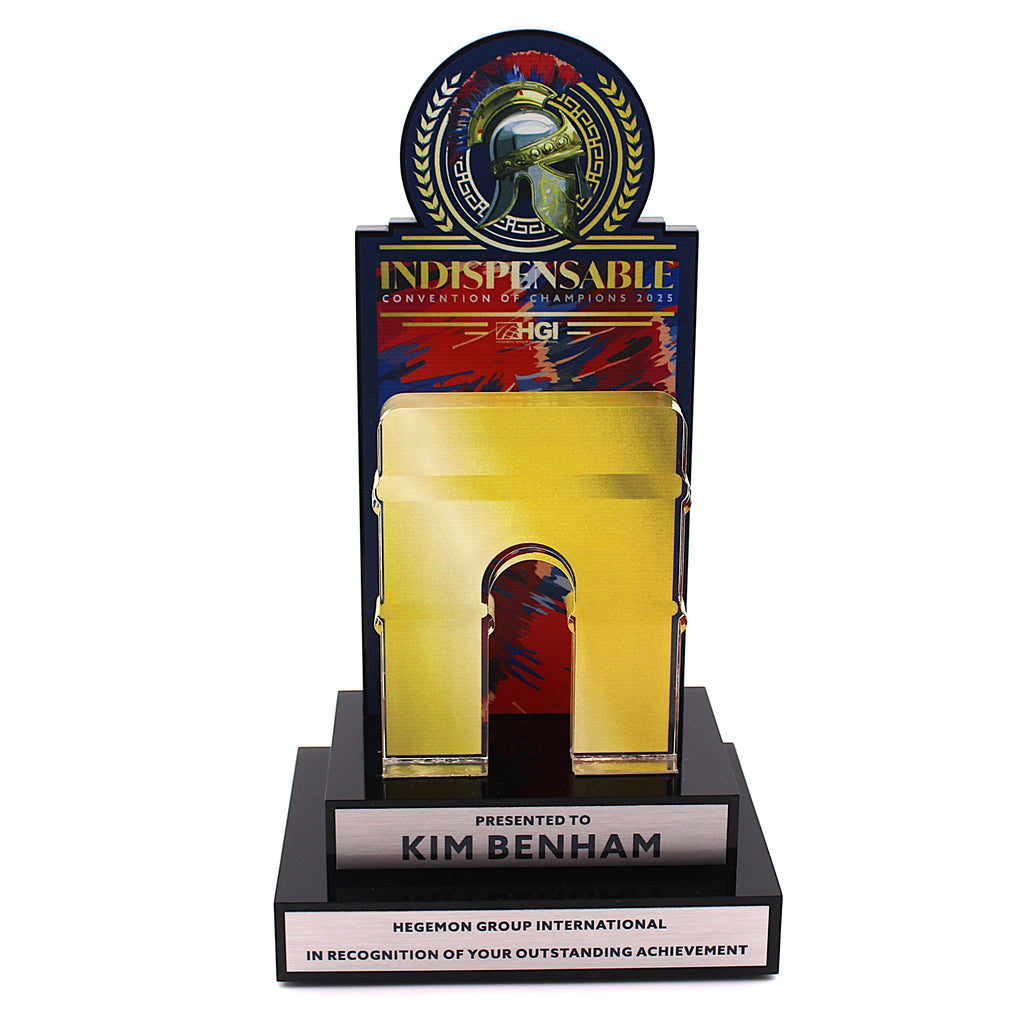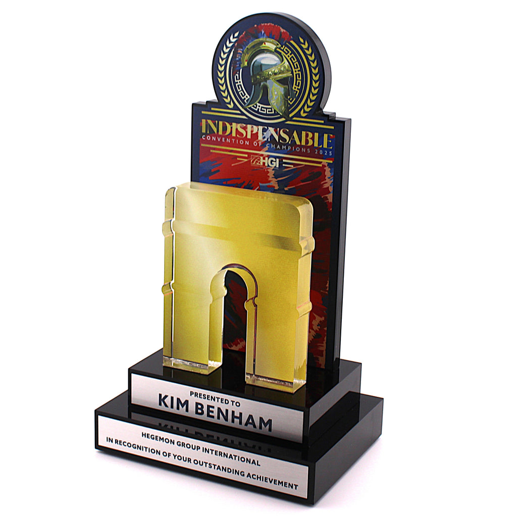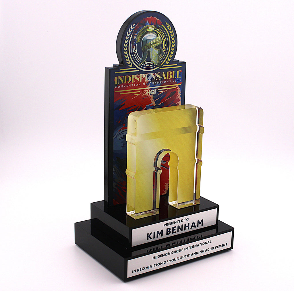 3/4-inch thick Optic Clarity Acrylic front with 3/8-inch back on a two-tier 3/4-inch gloss black base. Custom cut to your specifications, A silver or gold engraving plate can be added at no additional charge.