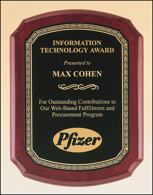 Rosewood stained piano finish plaque with a black brass plate and gold leaf design border. The same production techniques used to give expensive grand pianos their glossy look is available as a recognition award. Over six layers of lacquer are hand applied and polished to create our plaque boards. Laser engravable brass plate. Individually boxed. Plaque plates copyright design: TMC 2001 & 2002