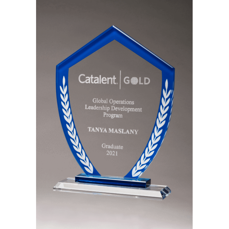 Shield shaped glass award with color border and white laurel leaves. 0.375" thick glass. Supplied with satin-lined, padded gift box.