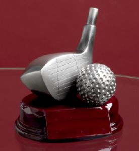 5" Silverstone DriverDriver and Golf Ball Hand-Crafted SilverStone Sport Sculpture has a pewter finished resin figurine set on a mahogany base with brass personalization plate.