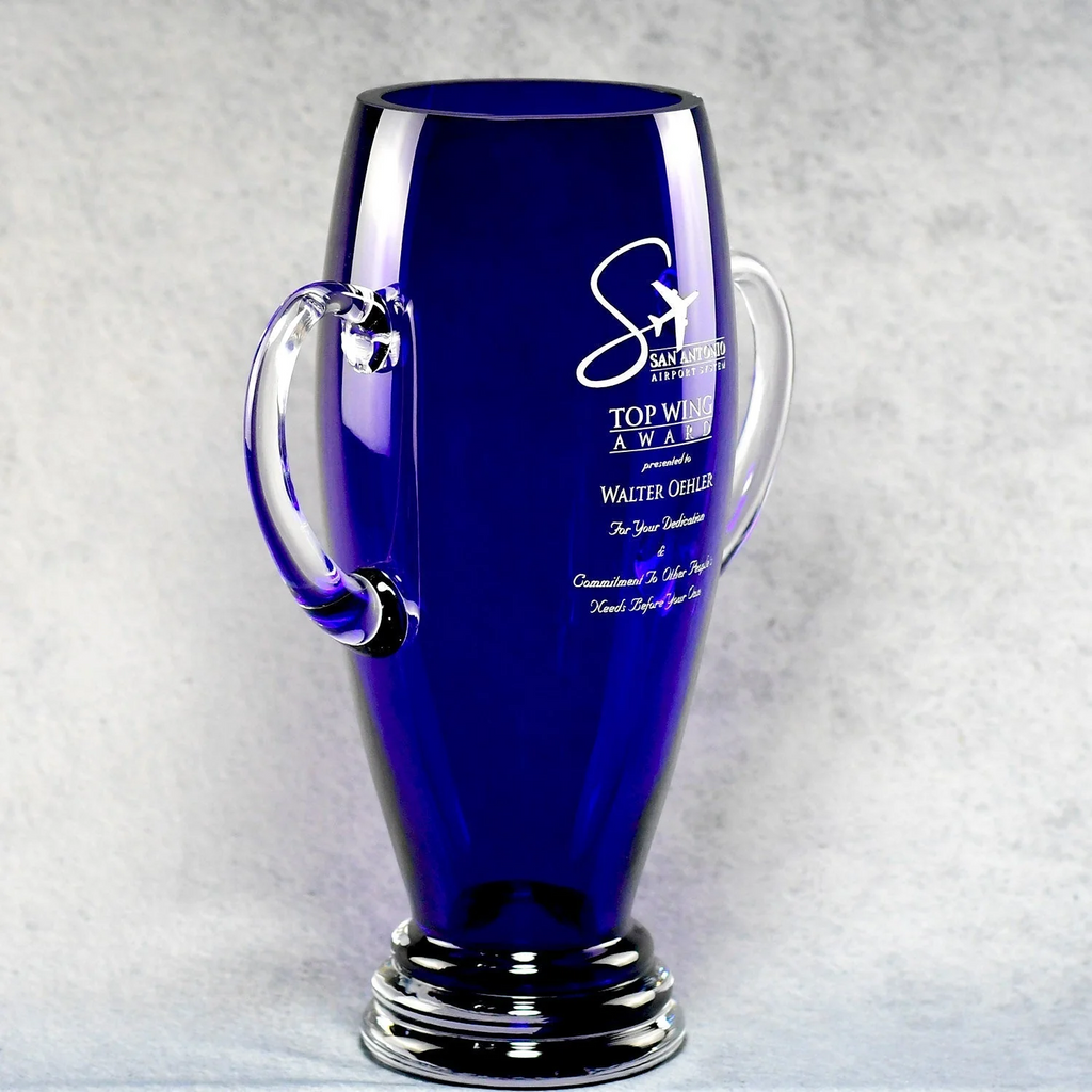 This cobalt blue oval vase with handles offers a large area to hold your logo and personalized text. Color filling in gold or silver is available to add impact to your personalized message. These vases work well in many settings including offices, country clubs, and homes. Fill them with flowers or your favorite beverage for an extra special touch when making the presentation to your special recipient. The handles offer the added benefit of drinking from this masterpiece in celebration of a championship win.