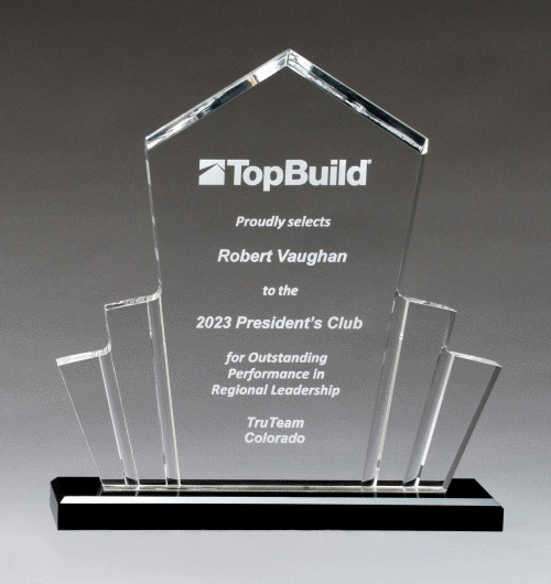 Large tower spotlight acrylic with black base. 0.75" thick clear acrylic. Individually gift boxed. 10" x 10.75"
